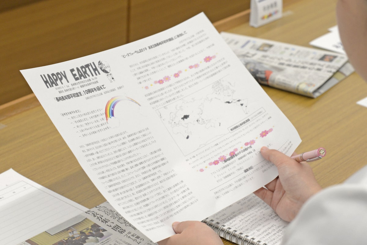 長崎女性平和委員会では、1990年から継続して「Happy Earth(ハッピーアース)」という機関紙を発刊しています。毎回ユース会議メンバーで話し合い、核兵器廃絶やSDGsなど様々なテーマを取り扱い作成しています。長崎の使命を学び深め、長崎から平和への思いを発信しています。