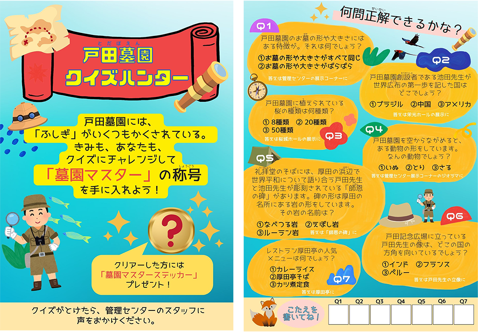 戸田墓園には、「ふしぎ」がいくつもかくされています。キミも、あなたも、クイズにチャレンジして“墓園マスター”の称号を手に入れよう!