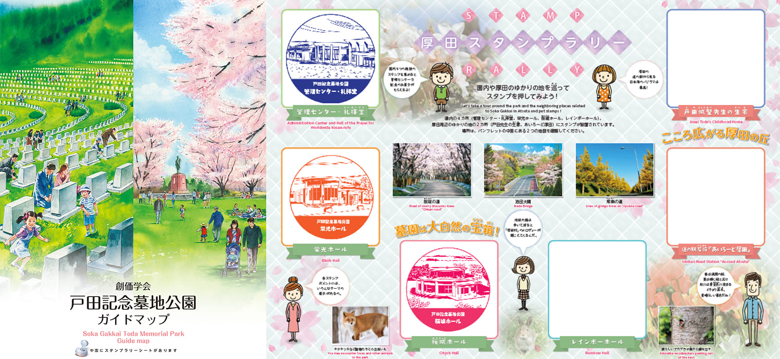 園内では、今年も心がわくわくする「厚田スタンプラリー」を実施しています。園内4カ所(管理センター、休憩所の栄光ホール・桜城ホール・レインボーホール)と、厚田周辺の創価学会ゆかりの地2カ所(戸田城聖先生の生家、道の駅石狩「あいろーど厚田」)にスタンプが設置されています。