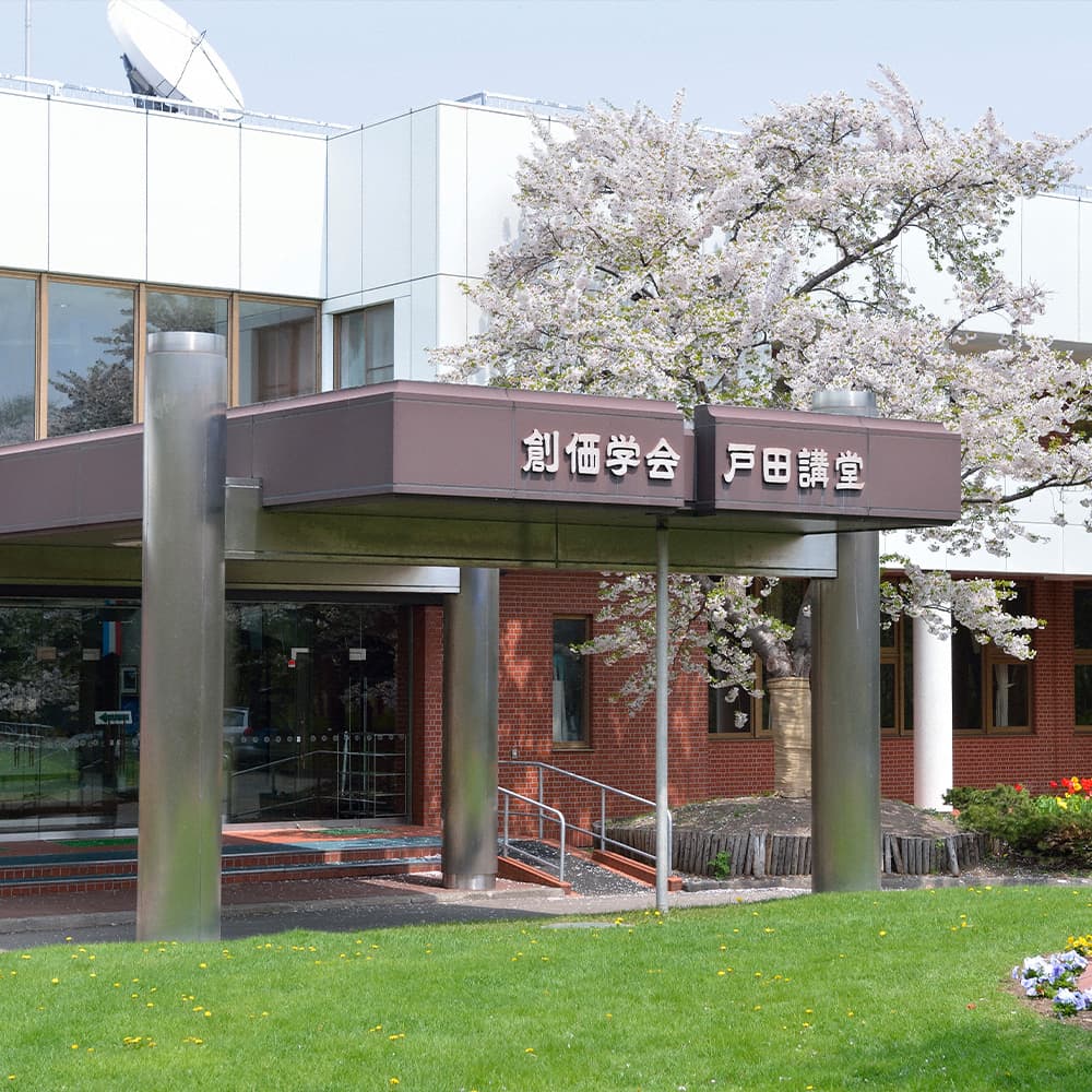 墓園のシンボルである戸田記念広場に隣接する休憩所で、館内には開放的な空間が広がり、室内から戸田先生の立像を望むことができます。40席ほどのイスやテーブルが設置され、持参したお弁当など飲食が可能。トイレ、授乳室、自動販売機(飲料)があります。