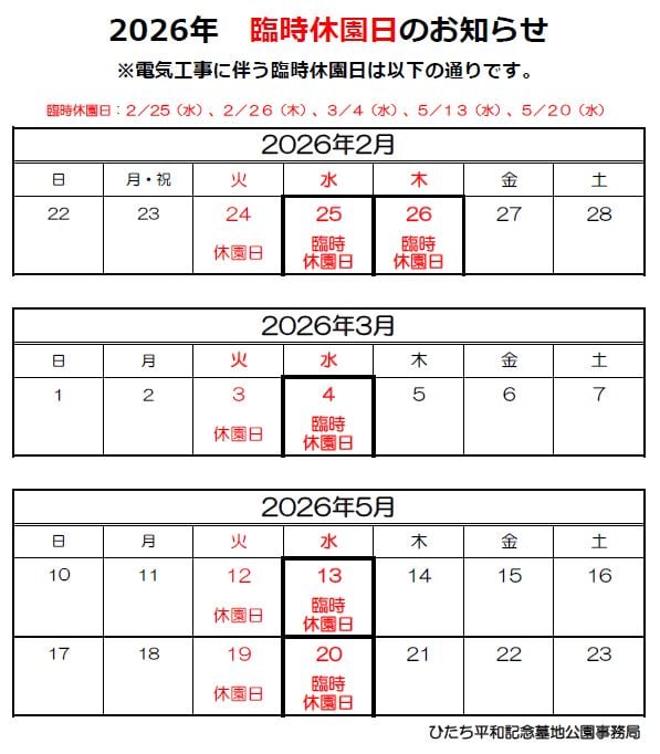 2026年 2月24日(火)※通常休園日 、2月25日(水) 、2月26日(木)