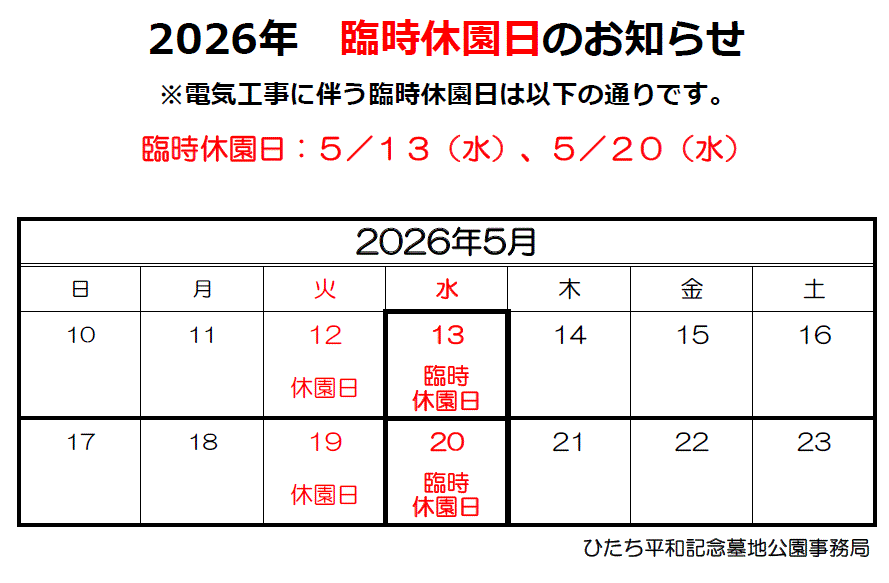 2026年 5月12日(火)※通常休園日 、5月13日(水)