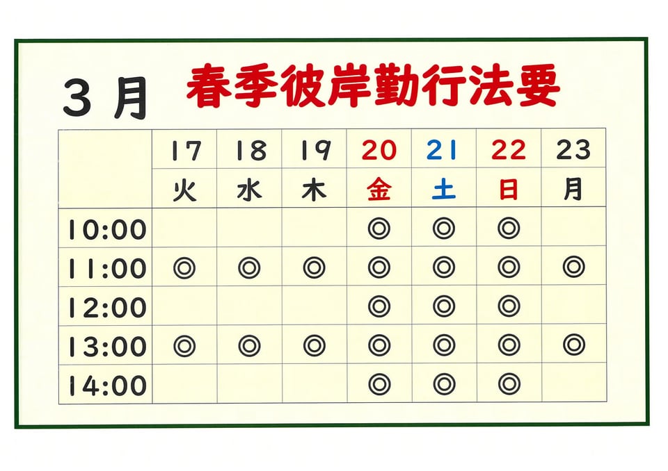 2026年「春季彼岸勤行法要」(3/17~3/23)における法要時間をご案内いたします。