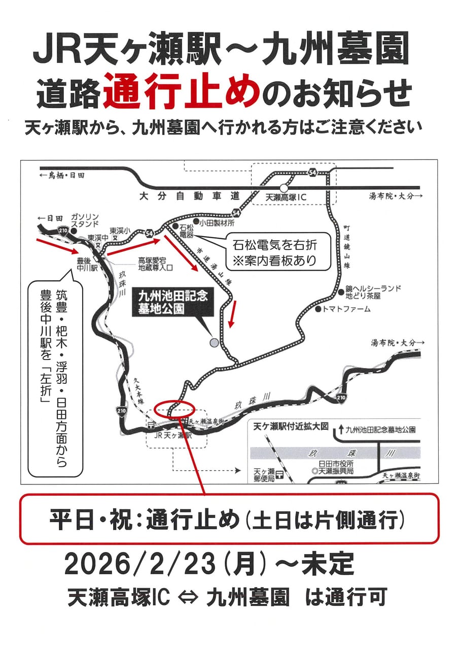 「JR天ヶ瀬駅」~「九州墓園」 一部通行止め のお知らせ