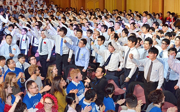 男子部大学校生らがオリジナル曲「ルーキー」を熱唱。苦楽を共にしてきた先輩や仲間たちへの感謝を込めて。