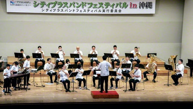 沖縄・嘉手納町のかでな文化センターで行われた「シティブラスバンドフェスティバルin沖縄」には、音楽隊の沖縄吹奏楽団が参加。「21世紀のマーチ」などを奏で、会場を盛り上げた。