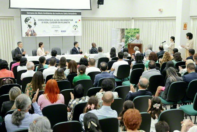 多くの来賓が駆け付けた式典では、アマゾン創価研究所のナシメント所長のあいさつ、ビレラ事務局長の講演の後、池田先生とSGIへの顕彰が、それぞれ原田会長と、ブラジルSGIのシラトリ理事長に手渡された。