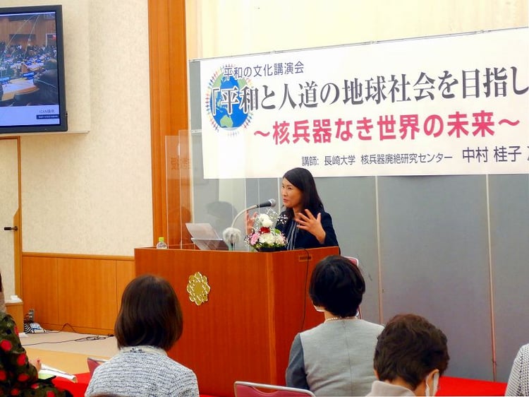 長崎大学核兵器廃絶研究センターの中村桂子准教授が、「平和と人道の地球社会を目指して」と題して講演。