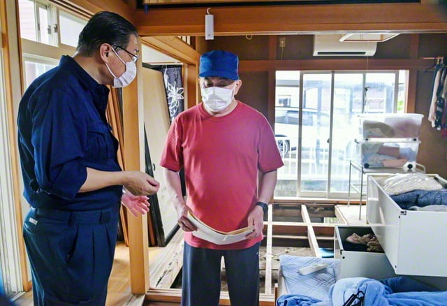 布施総秋田長は2023年7月18日、秋田市下新城地域へ。渡部さん(副支部長)は自宅が床上浸水に。「多くの皆さんが復旧作業を手伝ってくれて助かりました」と感謝を語った。布施総秋田長は「師の励ましを胸に、試練を乗り越えましょう」と励ましを送った。