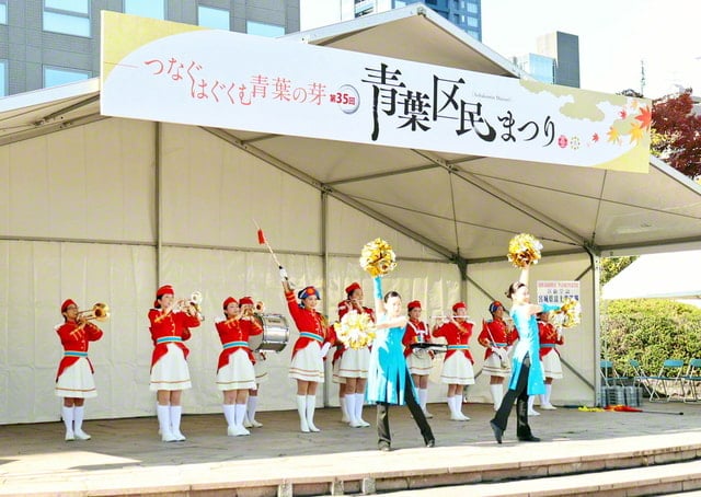 宮城鼓笛隊(渡邉書記長)が第35回「青葉区民まつり」で学会歌「華陽の誓い」など美しい音色を響かせ、ステージを飾った。平和の旋律と笑顔を届ける躍動の演奏・演技で観衆を沸かせた(3日、仙台市内で)