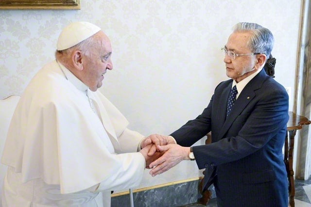 その後、会長は「人類の幸福と世界平和のために、今後も歩みを共にしたい」と述べ、教皇は、現今の社会情勢を憂いつつ、「戦争は敗北のしるしであり、絶対に消さなくてはいけません」と強調した。