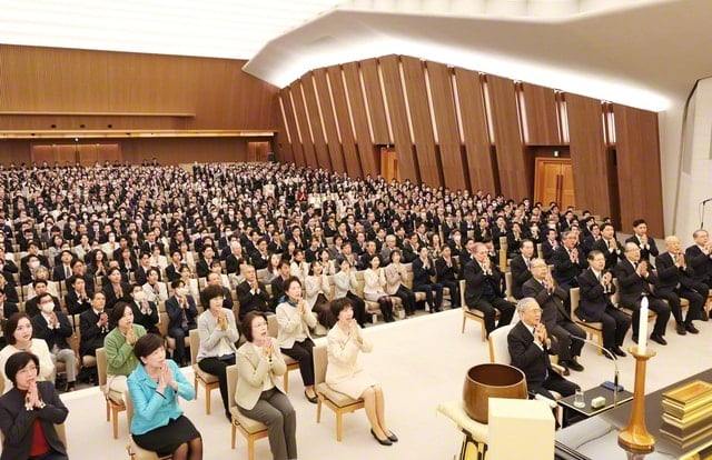 御聖誕の日を記念する勤行会が13日午後、東京・信濃町の広宣流布大誓堂で行われ、原田会長と共に各部のリーダー、首都圏の代表が出席した。