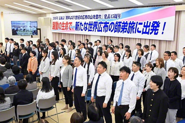 続いて新福九州青年部長が、今ここから青年の勢いあふれる前進をとあいさつ。インド創価学会から届いた祝賀映像では、代表によるエールの後、同国青年部が日本語で「青年よ広布の山を登れ」を合唱した。