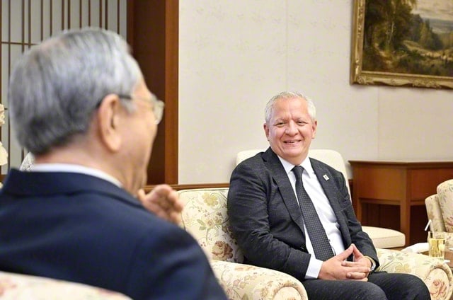 創大最高顧問の原田会長とネグレティ学術所長が会見