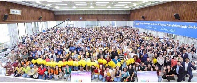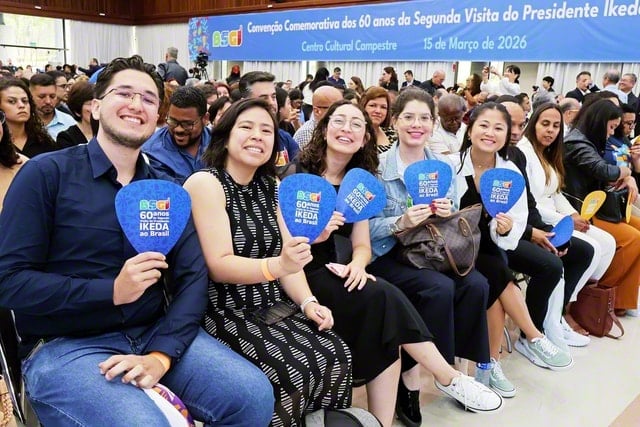 池田大作先生の2度目のブラジル訪問から60年を慶祝する同国SGI(創価学会インタナショナル)の記念総会が2026年3月15日午前、サンパウロ州イタペビ市にあるブラジルSGI自然文化センターで開催された。これには、谷川SGI理事長、那須同女性部長、西方同青年部長ら訪問団が、南米各国のリーダーと共に参加した。総会の模様は全土にオンラインで配信された。