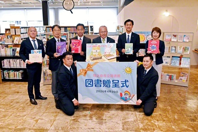 牧之原市での贈呈式は2026年4月20日、同市立図書交流館「いこっと」で行われた。杉本市長、橋本同市教育長に目録が手渡された。