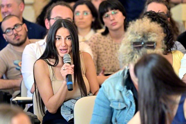 バルバラ・トリンコーネさんが、不屈の信心で病気や失業など相次ぐ困難に打ち勝ち、大学教員の道を切り開いた体験を発表。濵﨑SGI理事は、今いる場所で励ましを広げ、友の心に希望の太陽を昇らせようと呼びかけた。