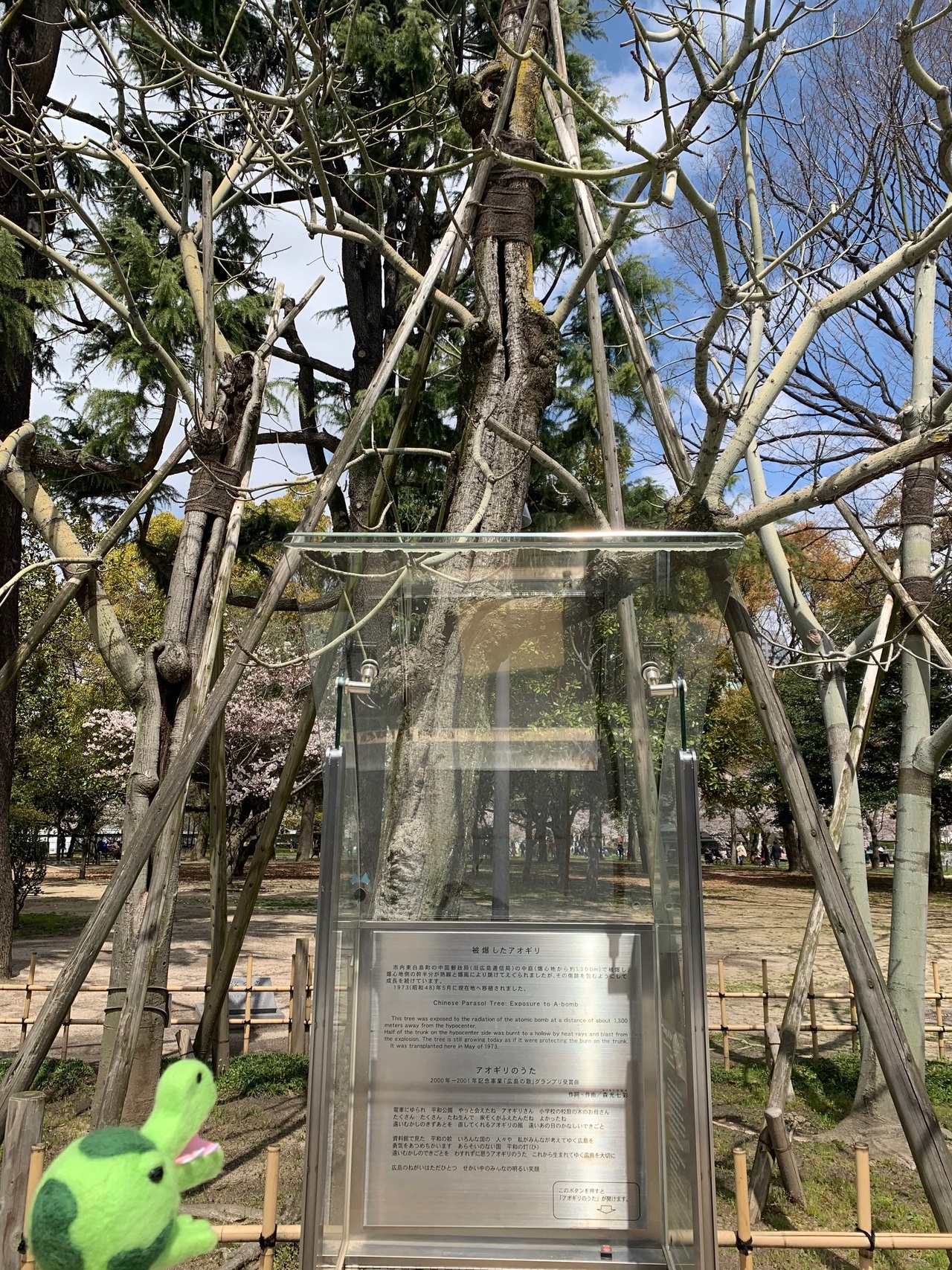 被爆当時、ハスの葉で傷をおおって火傷の痛みをしのいだ被爆者がたくさんおったそうじゃ。現在、周囲の池にはハスが植えられ、毎年8月6日の平和記念日には美しい花を咲かせるワニー。